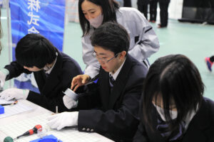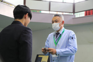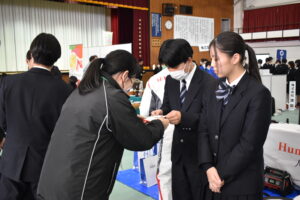 生徒の皆さんには最初に名刺交換のレクチャーを受けていただき、そのあと三回に分けてブースを回っていただきました。最後はフリータイムとして、興味のあるブースや話を聞いてみたい企業を自由に回っていただく時間を設けました。