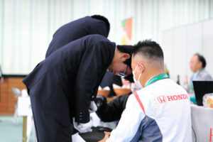 はじめに全体に向けた名刺交換レクチャーが行われ、生徒たちは実際に社員の方々と名刺交換を行いました。